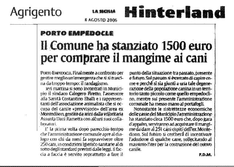 La Sicilia - 27 giugno 05 - Sfrattati i 190 cani dall'ex Montedison: il Comune ha già notificato il provvedimento alla signora Assunta Dani Rametta